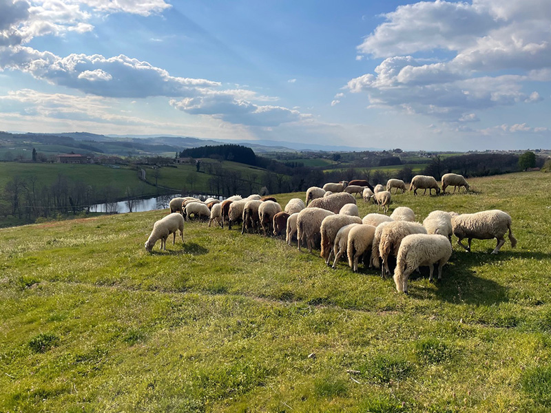 En 2017, lorsque je reprends la ferme, celle-ci compte quarante vaches allaitantes de races limousines et highland et une petite centaine de brebis. Sur les 92 hectares de surface agricole utile, 4 à 5 hectares de céréales sont produit chaque année pour l’alimentation des vaches et des moutons, le reste est en prairie pour le pâturage et la production de foin. L’ensemble de la viande produite est alors valorisé en vente directe, au détail sur le marché de Roanne tous les vendredis matin, ou en caissettes directement aux particuliers, notamment par le biais d’une AMAP.