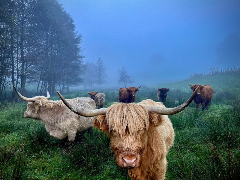Troupeau de Highland Cattle dans les fonds humides ©Rémi Janin