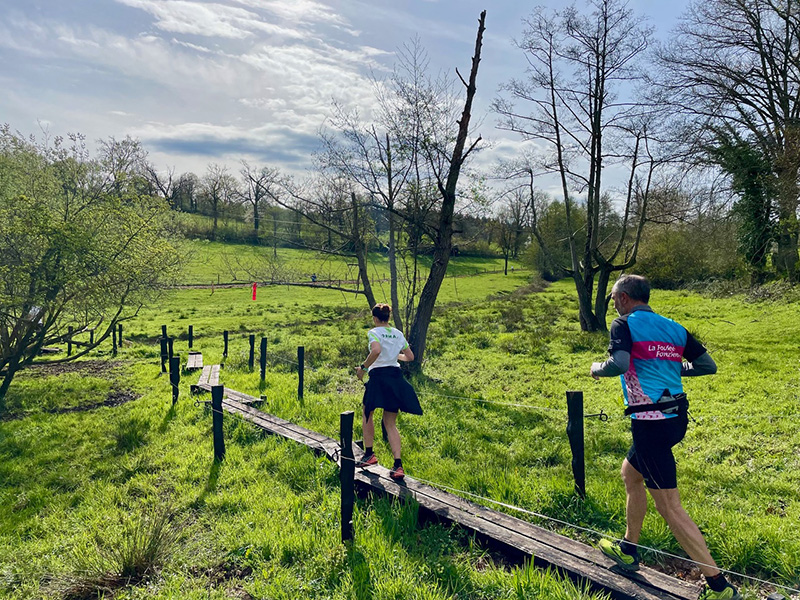 Passage d’un trail sur l’installation Le pas des noues dans les pâturages de fond de vallée (réalisation Pascaline de Glo de Besses et Jean-Sébastien Poncet (2022)) / Photographie@Remi Janin
