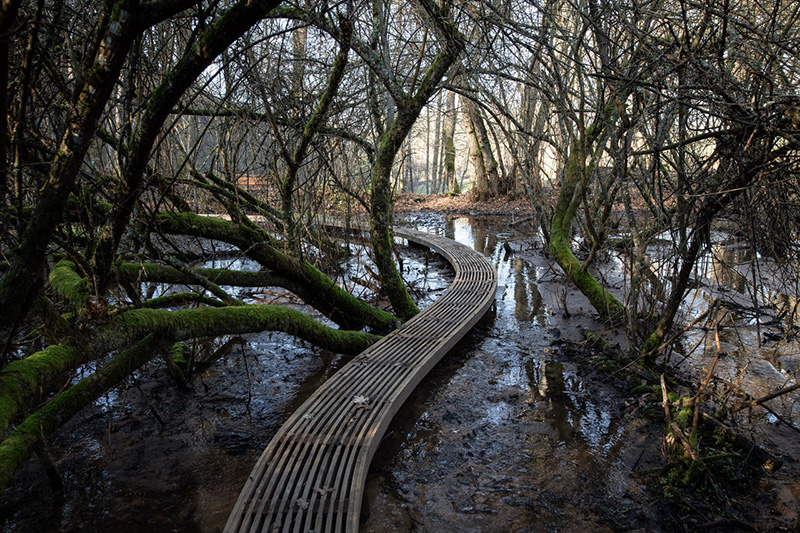 Installation Être étang sur un ancien étang désormais envasé sur la ferme et permettant le passage du sentier permanent porté par l’association Polyculture (réalisation Christophe Gonnet (2021)) / Photographie@Remi Janin