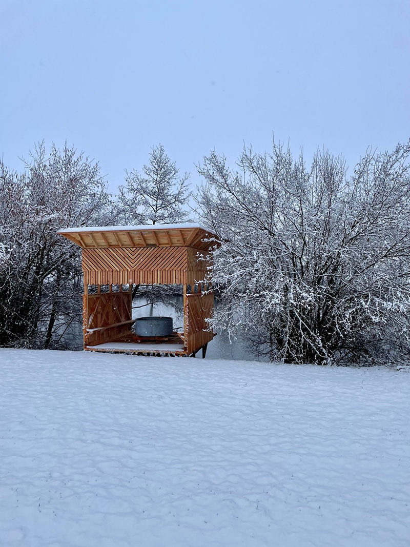 Installation Impluvium au bord de l’étang de la ferme (réalisation Collectif YAM (2023)) dans le cadre du projet de parc agricole et culturel de Vernand porté sur la ferme par l’association Polyculture depuis 2017, avec notamment la mise en place d’un sentier artistique permanent traversant le site et relié à un chemin de randonnée intercommunal, et l’organisation d’évènements ponctuels autour de spectacles vivants / Photographie@Remi Janin