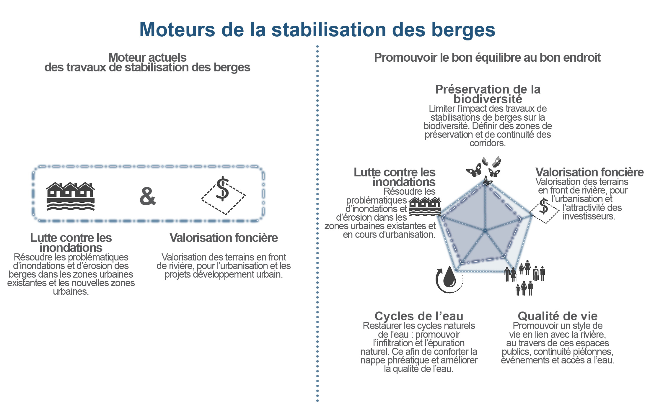 Il s’agit de restaurer un équilibre entre les différents enjeux parfois antinomiques : protection contre les inondations et lutte contre la subsidence, préservation d’une nature en ville et valorisation d’un foncier convoité, activités de loisirs en bords et restauration d’une eau de qualité et de ses cycles naturels.