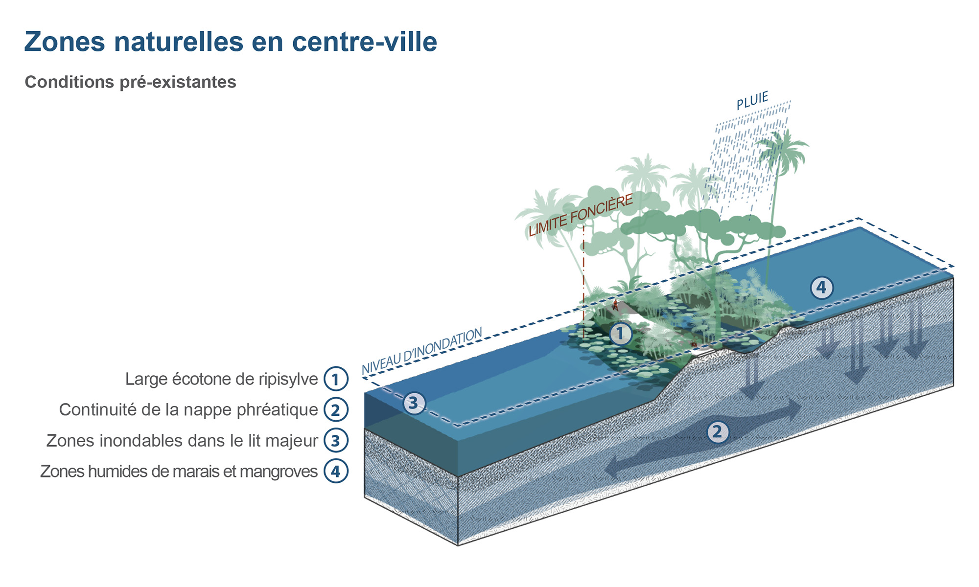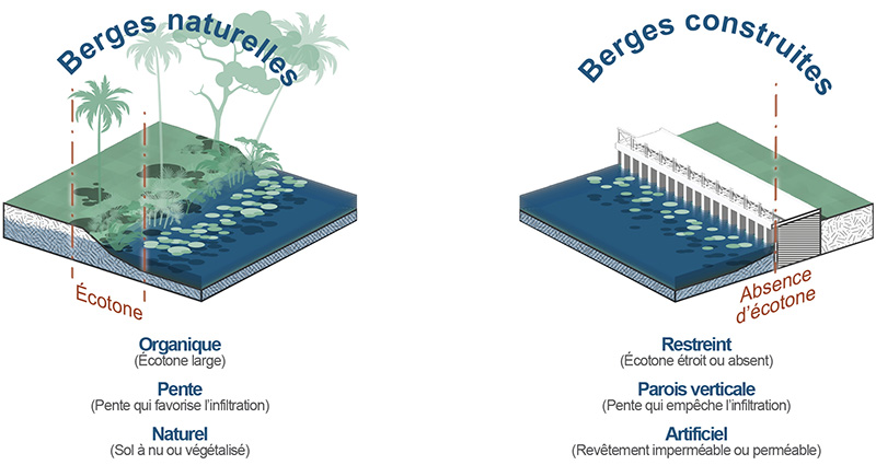 Dans ces 3 typologies identifiées, les conditions encore naturelles des berges offraient un écotone plus ou moins large. Ces espaces à l’interface entre rivière et terre assurent de nombreuses fonctions essentielles, corridors écologiques dont l’importance est liée à la largeur de cette bande. À plus grande échelle, ces zones naturelles permettent aussi de lutter contre les îlots de chaleur urbains (ICU). Les conditions naturelles permettaient également une libre extension de l’aquifère dans la largeur du lit majeur, et une mise en charge progressive de la rivière (parfois au détriment d’habitations vulnérables et riveraines) dans l’épaisseur de la berge limitant ainsi l’impact de la crue en aval. Les nombreux terrains encore naturels ou agricoles le long des berges, assuraient eux une infiltration des eaux pluviales limitant par ce fait la subsidence des sols.