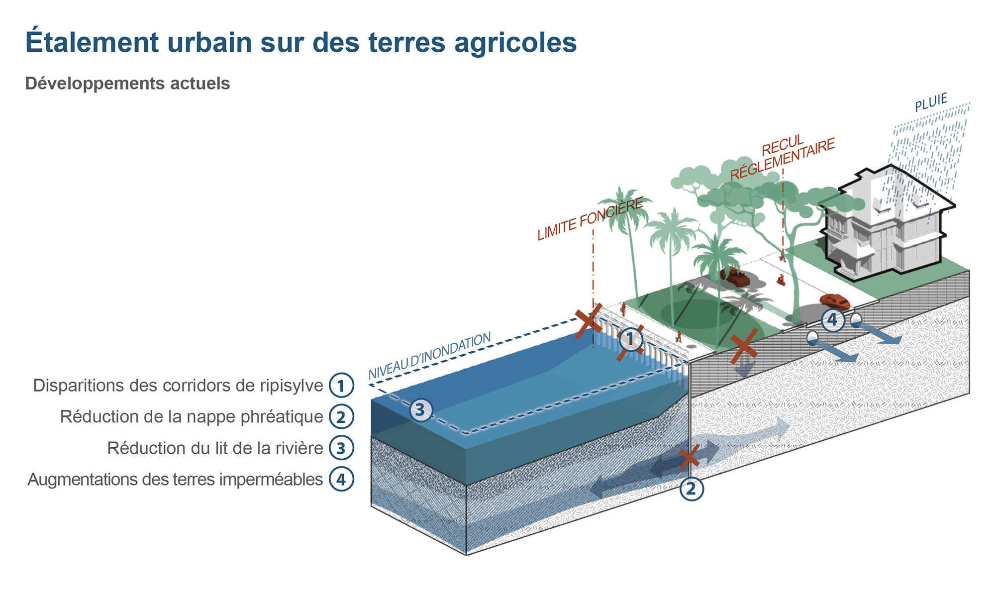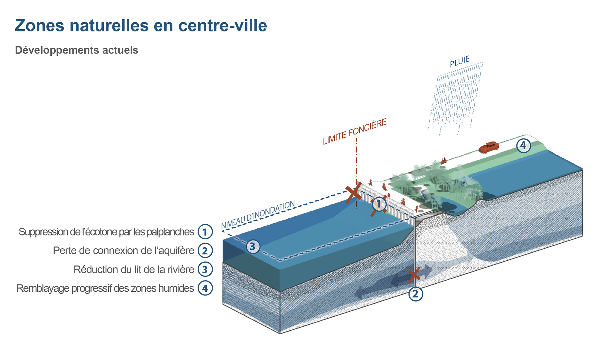 Cet objectif motivé principalement par la lutte contre l’érosion et la valorisation foncière des terrains attenants, entraine un fort impact sur la résilience urbaine, en affaiblissant les services écologiques rendus par les berges et la rivière. Dans ce contexte d’urbanisation en étalement et en densification, 3 typologies de situations ont été identifiées :