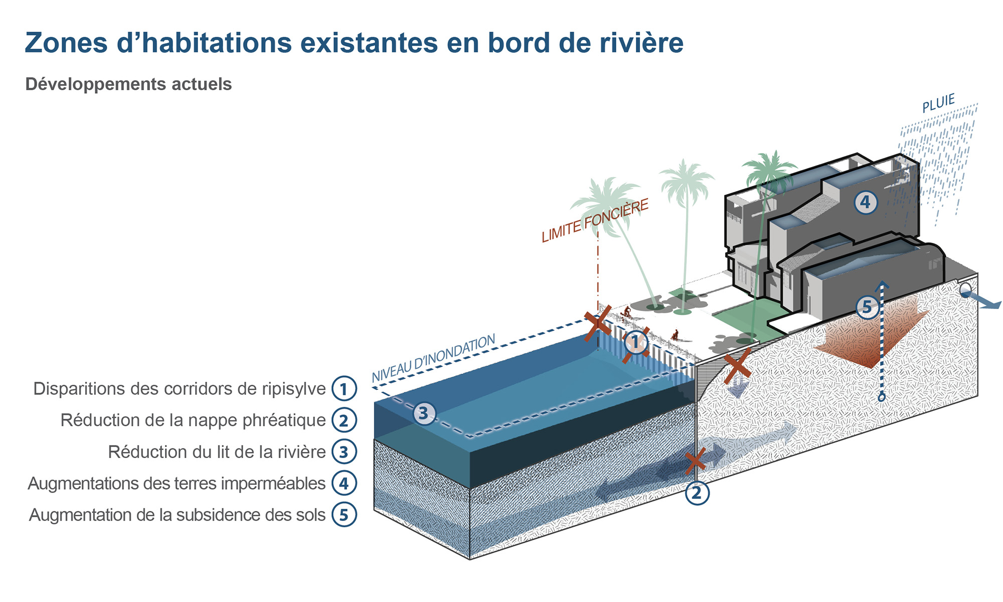 Les travaux de stabilisation et de contrôle de l’érosion entrepris par les autorités ont également d’autres effets à considérer. La bétonisation des berges élimine les opportunités pour la faune et la végétation de s’installer, créant ainsi un écotone stérile. Ces palplanches profondes de 20 à 30 m empêchent également les connexions avec la nappe phréatique, confinant l’aquifère derrière les murs. La construction des berges, couplée à leur élévation par des remblais, limite la capacité du fleuve à s’élargir en cas d’inondations. Le manque de surfaces perméables et la surexploitation de l’aquifère par des pompages locaux provoquent un tassement irréversible des sols, rendant les quartiers situés aux points les plus bas encore plus vulnérables aux inondations. Enfin, ces nouveaux sols imperméables vont réduire l’infiltration des eaux, augmenter le risque de ruissellement, et de saturation des réseaux de drainage urbains, favorisant ainsi les phénomènes locaux de crues soudaines.