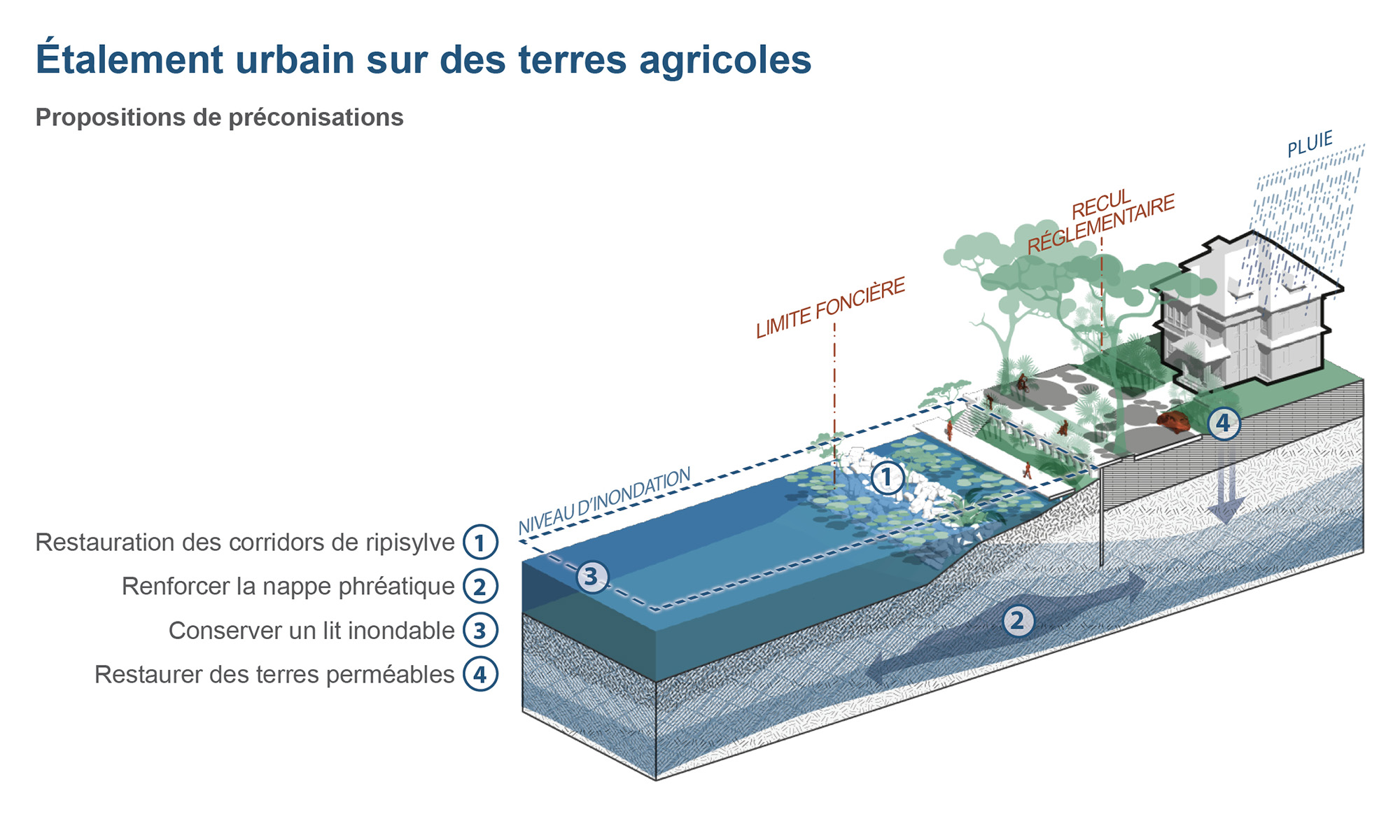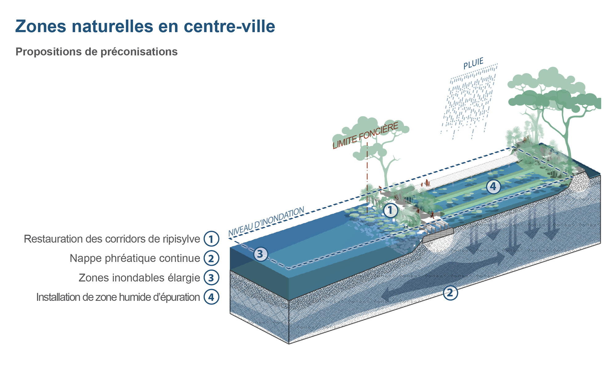 Un étagement de la berge, permettant à la rivière de s’étendre sur des zones contrôlées, participerait également à la réduction des crues en aval.