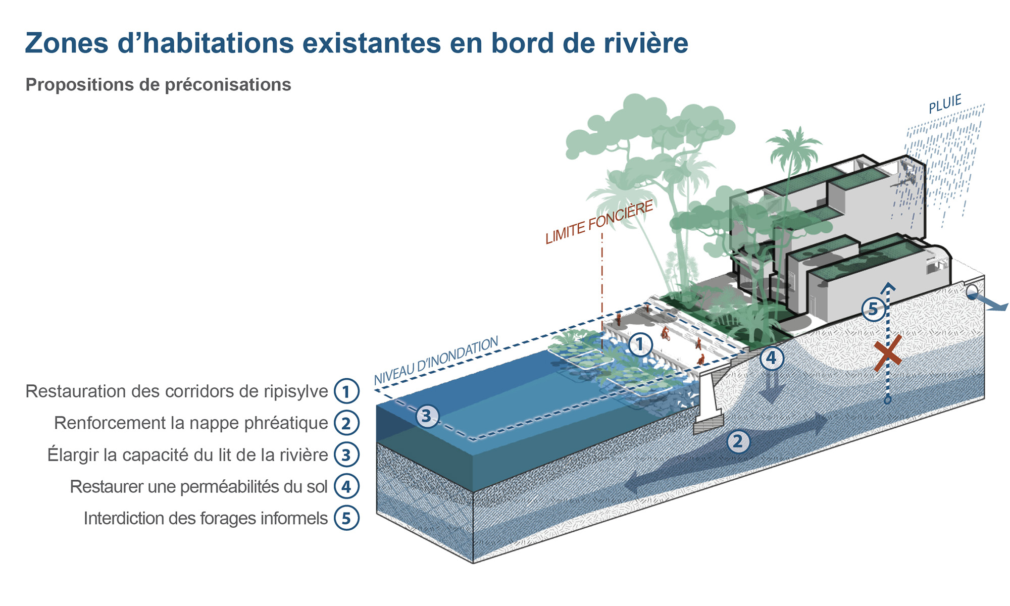 Sont également proscrits : les constructions (ou limite à 3 ou 5 % de la surface), les activités polluantes, les extractions de sable, ou le pompage intensif. Mais cette législation ne concerne ni le traitement des berges, ni les niveaux, ni la définition des surfaces de ce corridor de protection. Peu contraignante in fine, elle permet aux promoteurs de « clôturer » leur terrain, et d’en utiliser toute la surface. En effet, dans le cadre d’un projet privé, l’espace donné à la rivière pour avoir une berge plus souple serait à perte, puisque décompté du ratio des surfaces « vertes » à atteindre, et donc un manque à gagner en termes de surfaces à commercialiser. À cela s’ajoute un manque de solidarité amont aval, où chaque opération tente de se prémunir des risques d’inondations le plus efficacement possible, quitte à faire ruisseler chez son voisin.