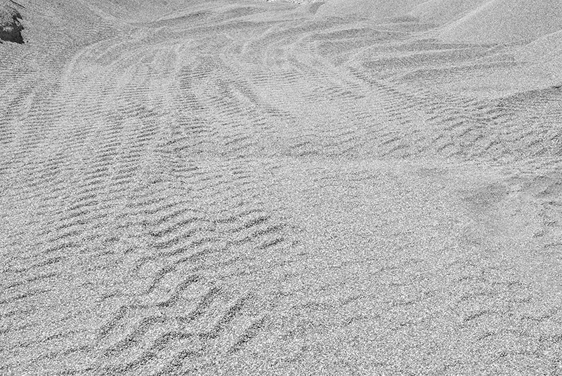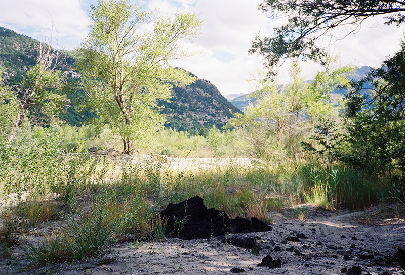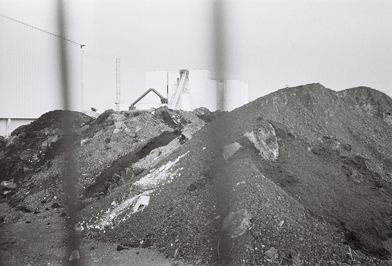 C’est ainsi que je me suis retrouvée dans différentes usines d’enrobé autour de Marseille, où bitume et gravier sont mélangés à très hautes températures. L’une d’entre elles est en cours d’agrandissement. Mais aussi dans les gravières de la Durance et jusqu’à sa source, là où la montagne s’érode, charriant ses matériaux vers l’aval, mêlés à ceux de ses affluents, puis dragués par les gravières avant d’être acheminés vers les centrales d’enrobage. Sur le crassier d’ArcelorMittal, une montagne de laitiers de hauts-fourneaux en plein milieu d’une zone humide. Les laitiers furent longtemps désignés comme « déchets industriels » de cette industrie métallurgique et aujourd’hui renommés « matière première », intégrés à la fabrication d’enrobés dits « verts ».