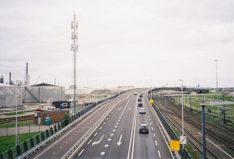 Cette recherche m’a également menée vers Fos-sur-Mer, dans les zones humides du delta du Rhône, le long des raffineries bordant les routes, où le pétrole est importé et transformé en bitume. J’ai également traversé le delta du Rhin, là où le grand port industriel de Rotterdam s’étend par son emprise monumentale et son odeur pétrolifère. Premier port d’Europe, il concentre une grande partie des flux de pétrole destinés au continent.