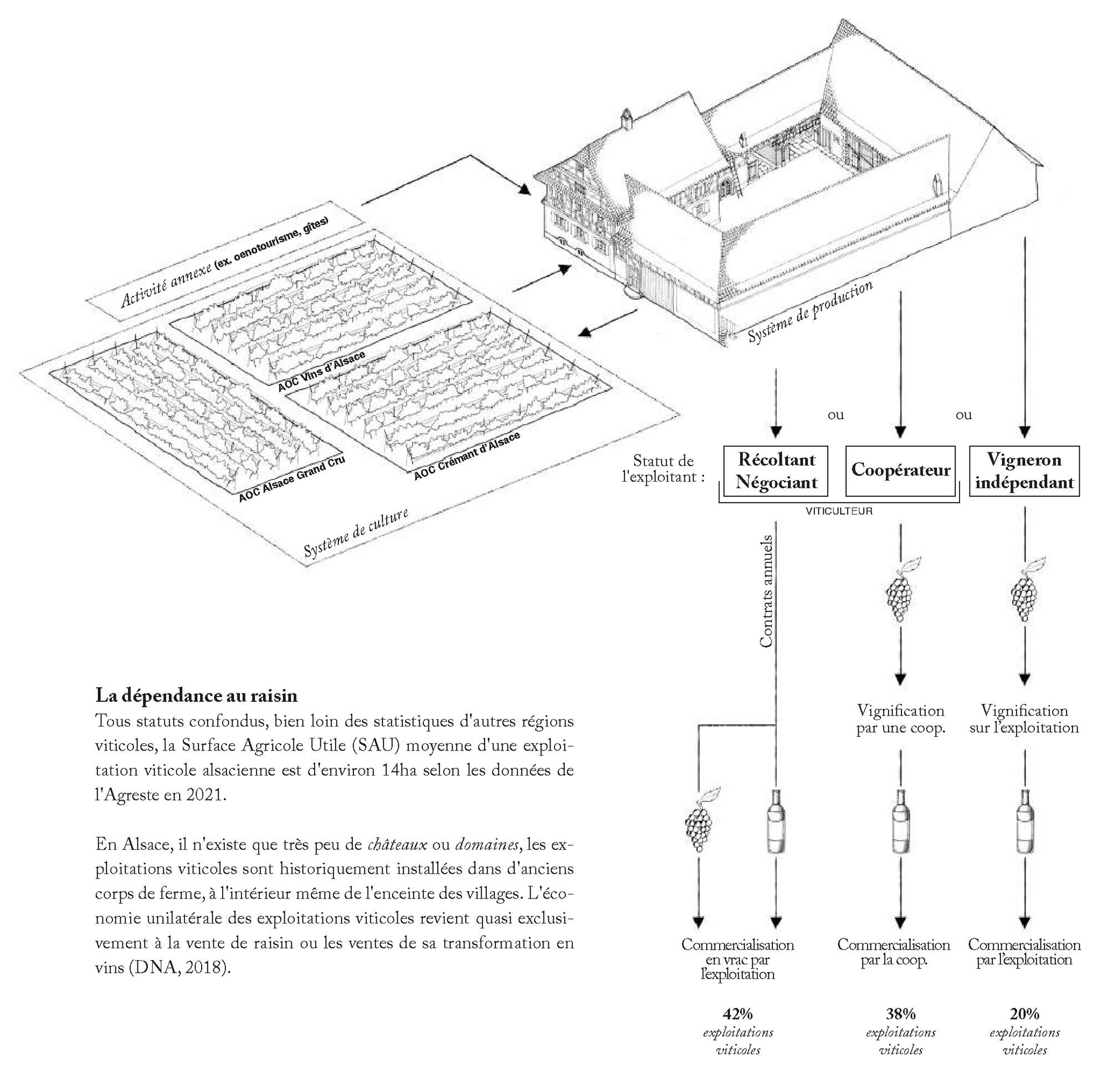 Schéma de fonctionnement des exploitations viticoles alsaciennes, un modèle de dépendance reposant quasi exclusivement sur la vente de raisin ou les ventes de sa transformation en vins ©Simon Metz