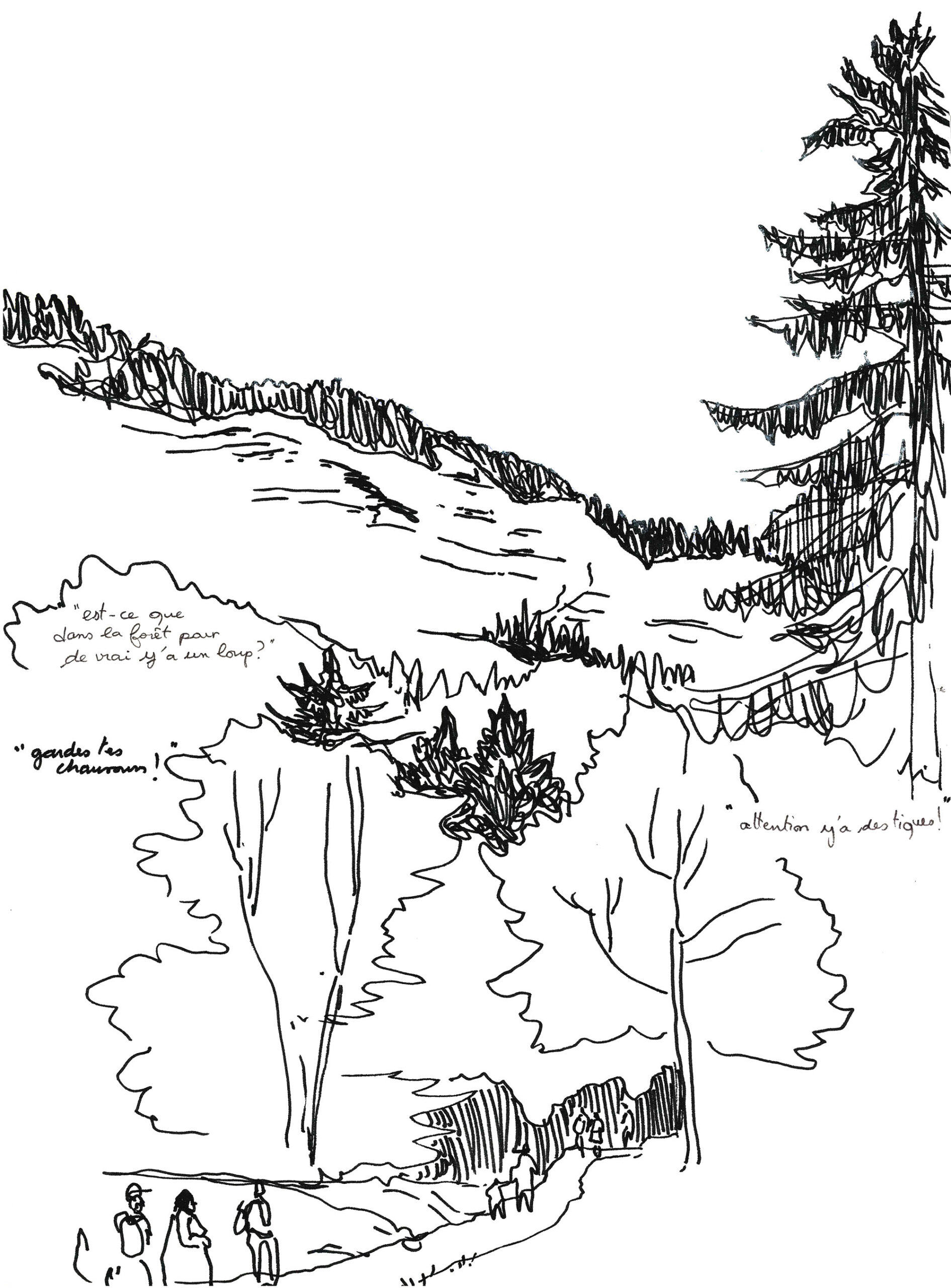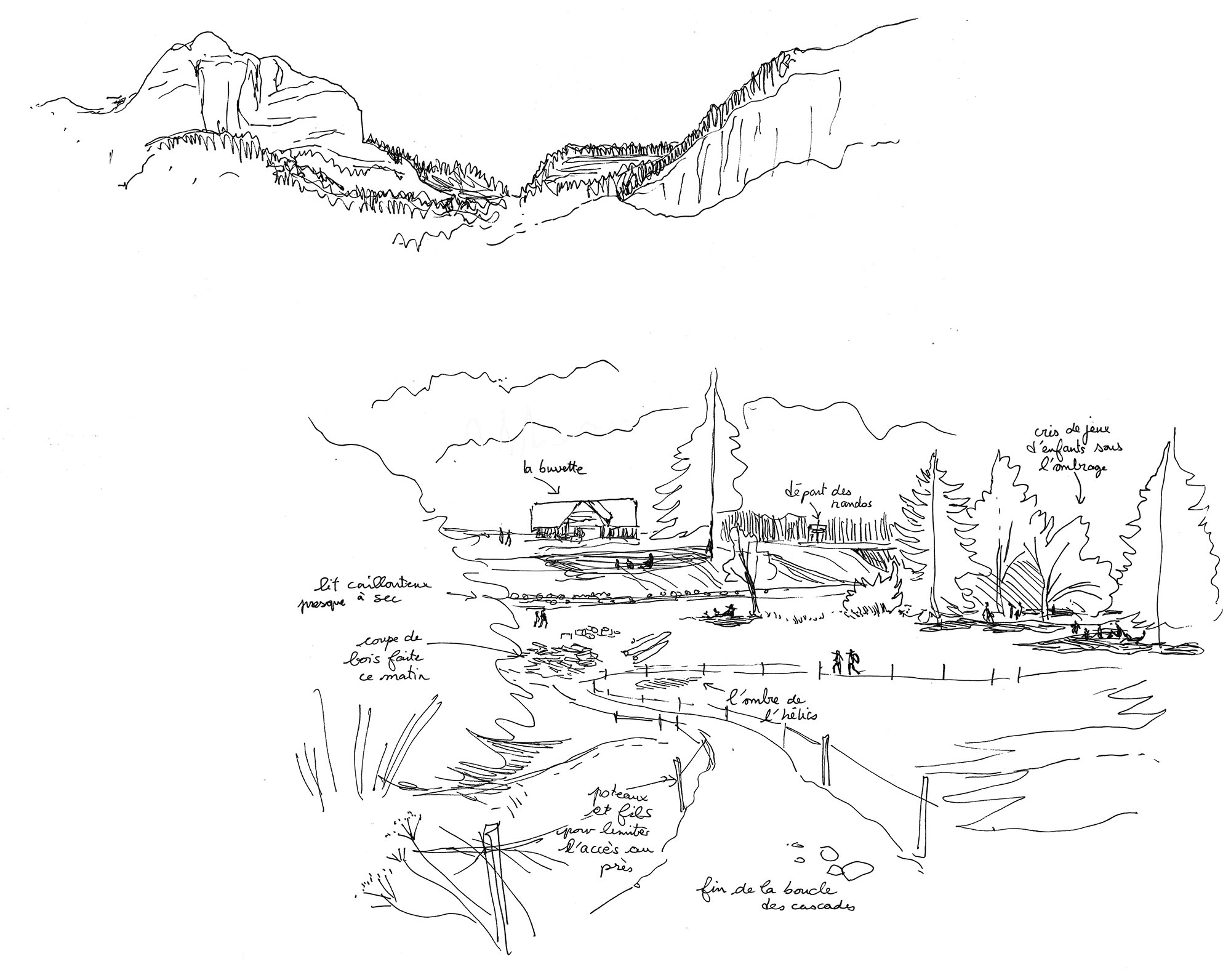Soudain, un brouhaha insupportable emplit le ciel. Un hélicoptère apparait. Le bruit amplifié par la caisse de résonance du cirque nous trompe, on croirait entendre des dizaines d’engins volants. Des nuages de poussière et d’épines de pin s’envolent autour de nous. Ça gronde comme l’orage, ça tape comme un marteau-piqueur, ça vrombit comme une horde de motos. Dans le cirque de Saint-Même, le rapport au son est différent de ce que je peux connaître ailleurs : les cloches des vaches, les éclats de voix et les moteurs de tronçonneuses résonnent de manière excessive, les vrombissements d’hélicoptères de secours emplissent le site d’échos tellement démultipliés par les parois à tel point que cela devient douloureux pour les oreilles. Cette particularité acoustique est essentielle dans l’appréciation sensible de ce site, elle est un élément crucial à prendre en compte pour adapter la fréquentation et les moyens motorisés d’accès au site.