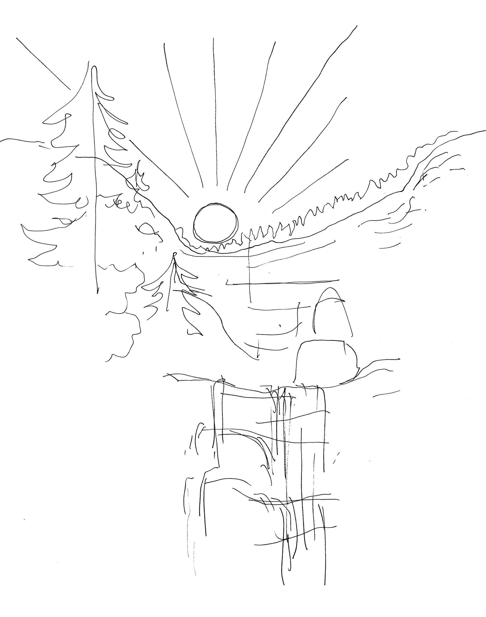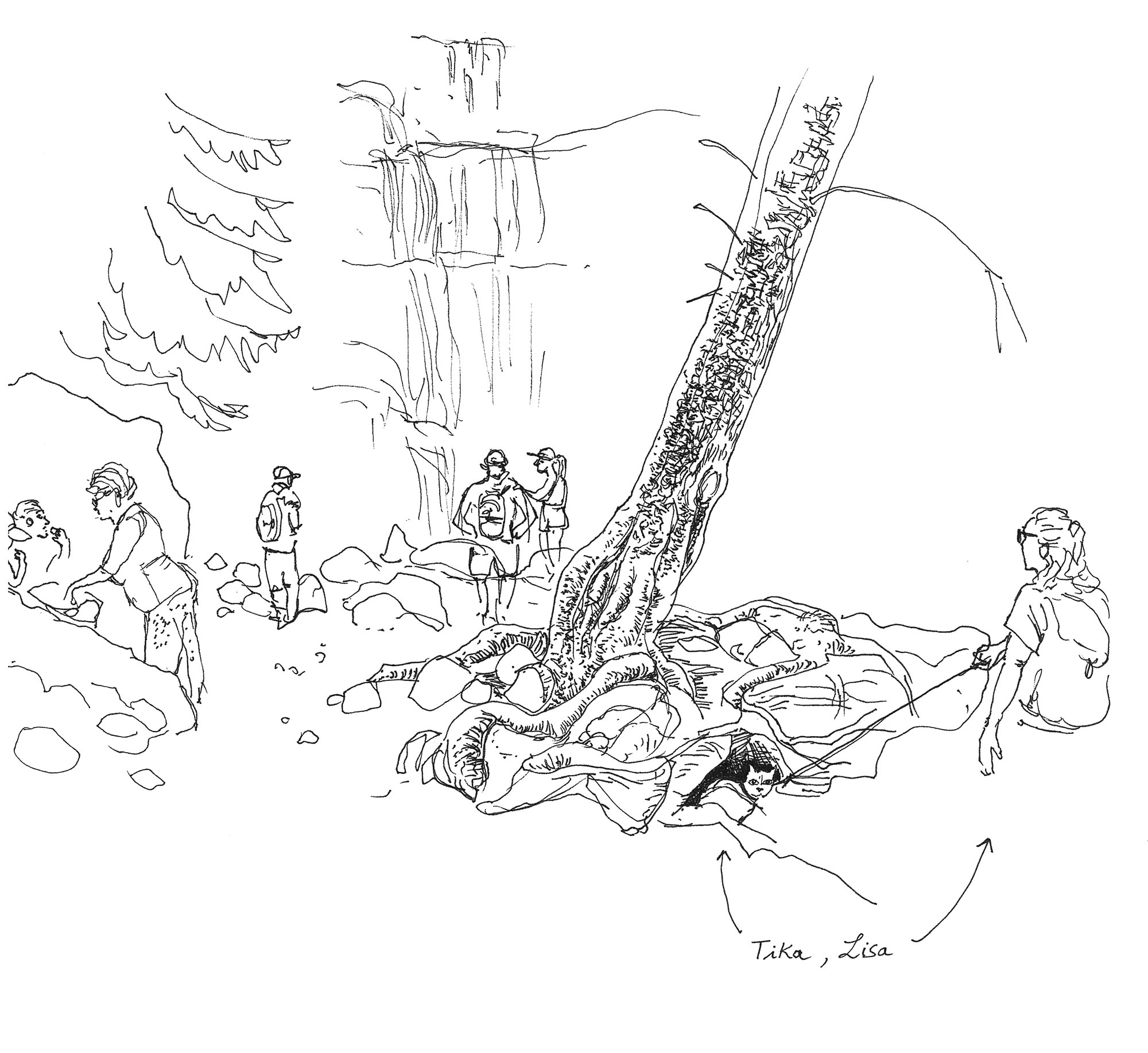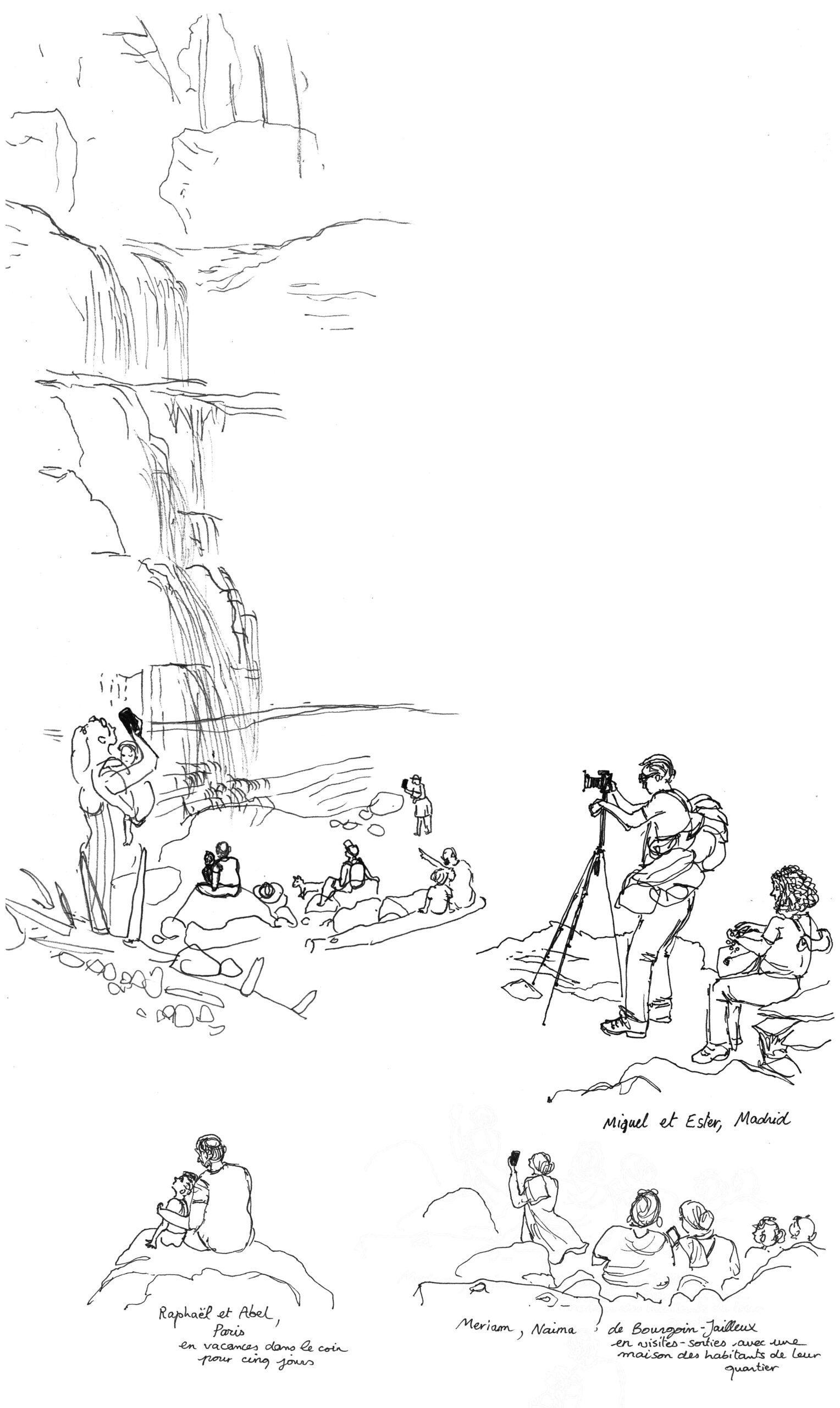 À midi pile, le soleil surgit au-dessus de la grande cascade. On ne voit alors plus rien à cause du contre-jour. Le bruit de la chute d’eau est omniprésent et couvre tous les autres sons. Les visiteurs se délectent dans cette oasis atteinte après un effort très variable d’une personne à l’autre. Mes pauses régulières pour dessiner me permettent d’observer et de dialoguer avec les visiteurs présents ce jour-là : des vacanciers logeant dans le secteur, des visiteurs venant d’autres régions ou d’autres pays, des personnes venues en bus des villes voisines, en visite à la journée.